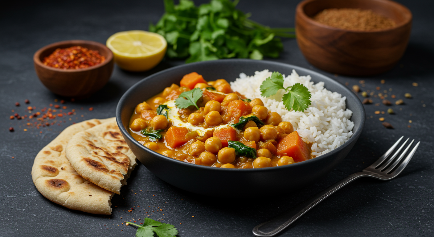 Curry z soczewicą: Charakterystyczne dla kuchni indyjskiej, zasobne w białko dzięki soczewicy. Można je podać z ryżem lub naanem.