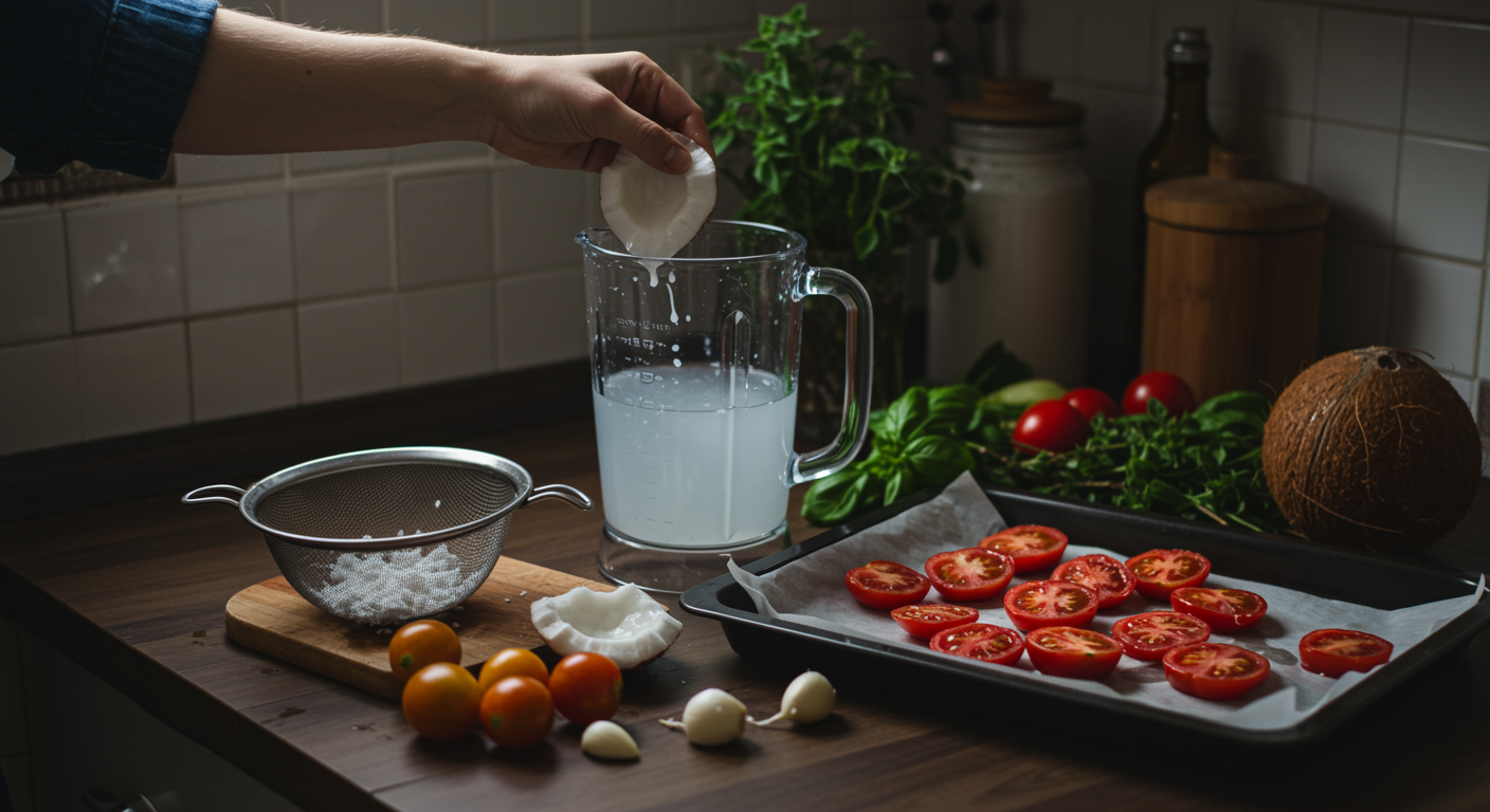 Przygotowanie mleka kokosowego w domu jest prostsze, niż mogłoby się wydawać. Rozpocznij od zagotowania wody, a następnie odstaw ją na minutę, aby nieco ostygła – nie powinna być wrząca, ale bardzo gorąca (około 80-90°C), co pomoże w ekstrakcji tłuszczu i smaku z wiórków. Jaka temperatura jest optymalna do suszenia pomidorów w piekarniku? To kluczowe, tak samo jak przygotowanie pomidorów do suszenia – usuwanie gniazd nasiennych jest niezbędne. Należy również usunąć gniazda nasienne przed suszeniem. Przełóż wiórki kokosowe do blendera i zalej je gorącą wodą w wybranych proporcjach. Miksuj na najwyższych obrotach przez 3-5 minut, aż mieszanka będzie gładka i kremowa, a cały przepis, jak zrobić suszone pomidory domowym sposobem w piekarniku, wydaje się bardzo prosty. Zastosowanie odpowiednich technik blendowania jest kluczowe dla uzyskania idealnej konsystencji mleka kokosowego.